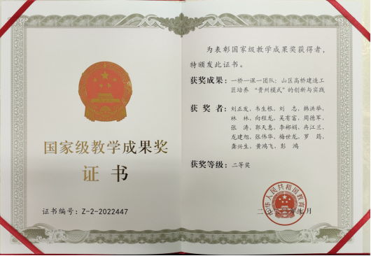 学院通过持续探索与实践,逐步形成以“一桥一课一团队”为核心的山区高桥建造工匠培养“贵州模式”。该模式高度契合教育高质量发展对专业适应性和产业匹配度的新要求,成功打造“学高桥到贵交”职业教育品牌,荣获国家级教学成果二等奖和省级教学成果特等奖。通过该模式,打造了全国高校黄大年式教师团队——喀斯特山区道路桥梁工程技术专业群教师团队,建成了教育部课程思政示范课程——《桥梁工程试验与检测》。